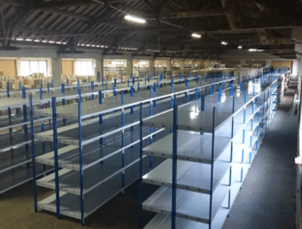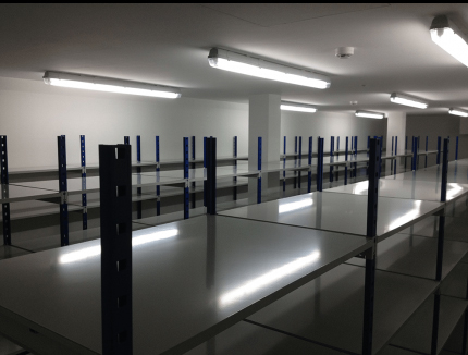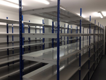 Réalisation d’une zone d’entreposage avec des éléments en simple et double stockage, les tablettes sont équipées d’une plaque métallique pour déposer des éléments de petites tailles.