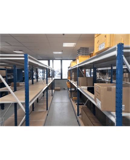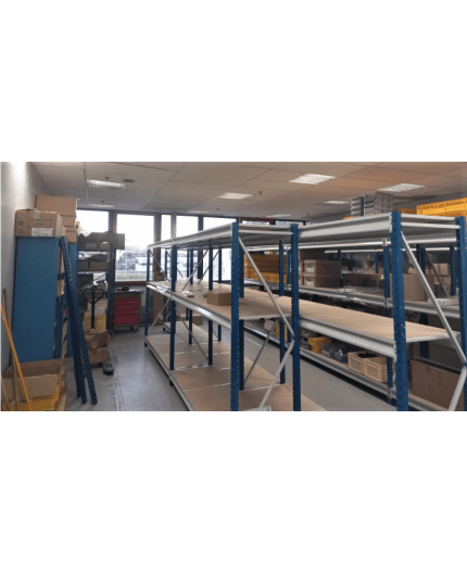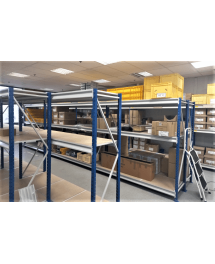 Le client à utiliser un rayonnage mi- lourd en version 850 kg en 2 mètres de haut, 600 mm de profondeur plusieurs longueurs de lisses ont été utilisés pour optimiser au maximum l'espace de stockage.