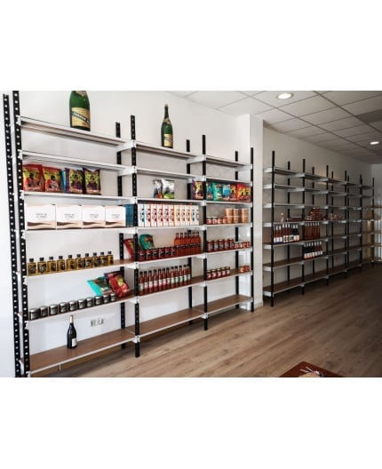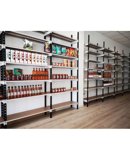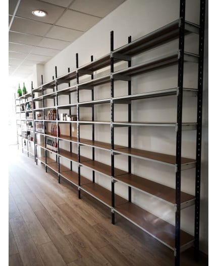 Notre client a ici souhaité installer les rayonnages léger 180kg, dans la partie magasin, ouvert au public, pour y présenter ses produits.
