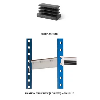 La structure de cette étagère et les tablettes sont en acier résistant, de finition peinture époxy bleu (RAL 5005) pour les montants et gris clair (RAL 7035) pour les niveaux. Le rayonnage pour boites d’archives en carton est livré en kit avec une notice de montage, pas de vis pas de boulon, il est facile à monter. Cette étagère est modulable, le réglage des niveaux se fait tous les 50 mm (pas de 50 mm, c’est la distance entre deux perforations sur les montants).