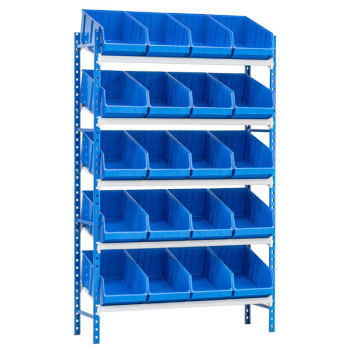 Tous les détails du produit Rayonnage incliné pour picking avec 5 niveaux et 3 types de bacs à bec en plastique bleu